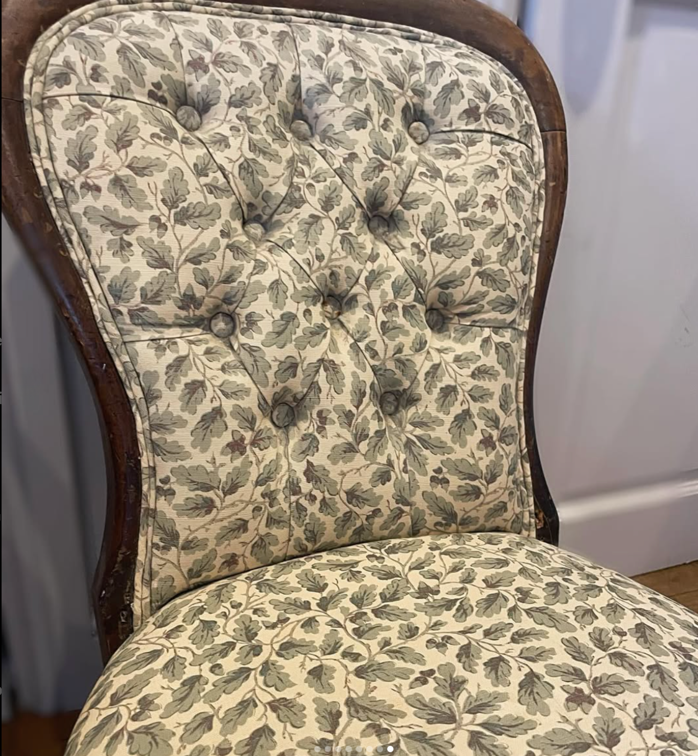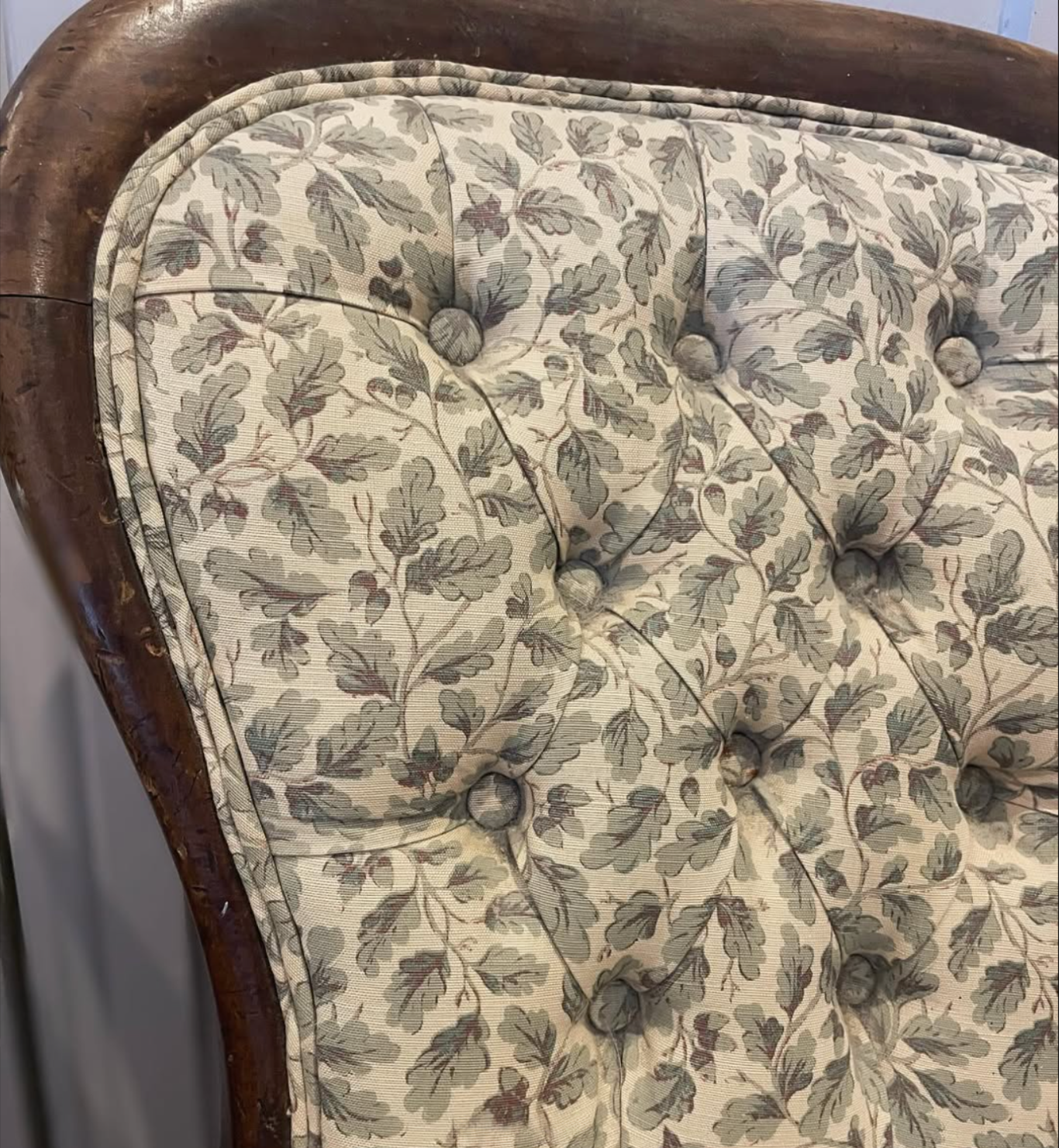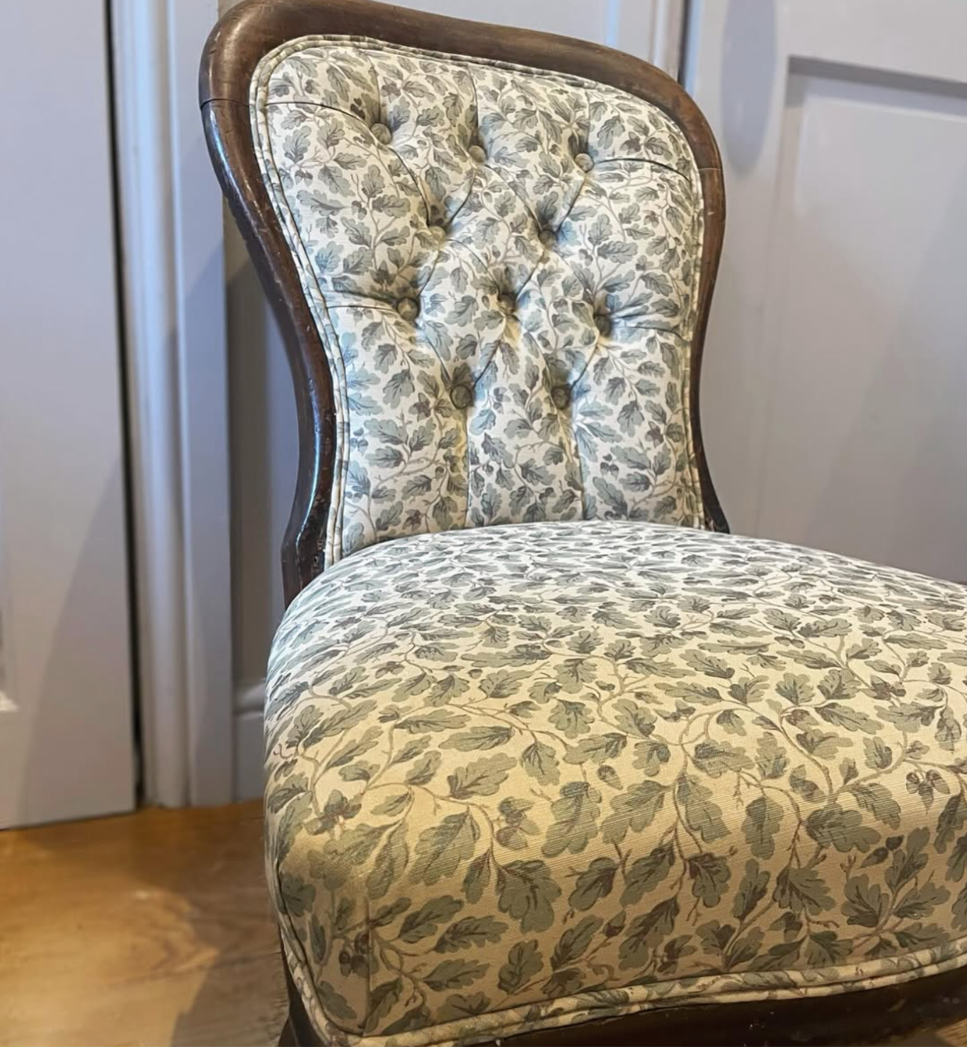 Victorian Buttonback Nursing chair upholstered in Bennison ‘English Oakleaf’