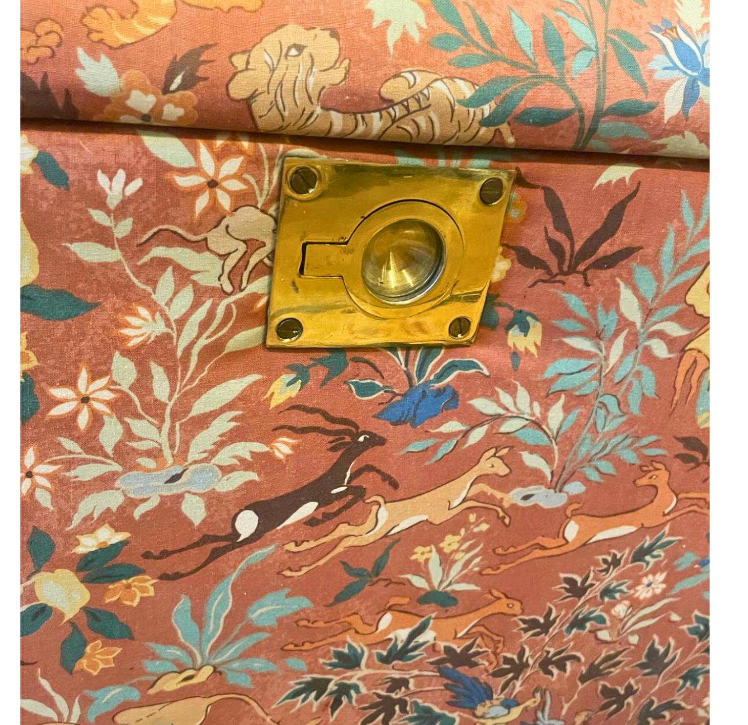 This vintage trunk is upholstered in an ornate, vintage fabric, its intricate design featuring stylised florals, scrolling arabesques, and delicate filigree motifs rendered in soft greys, muted ivories, and hints of deep teal. Polished brass corner protectors, strapping and clasps add a warm metallic contrast, their gentle patina underscoring the piece’s authentic antique character.